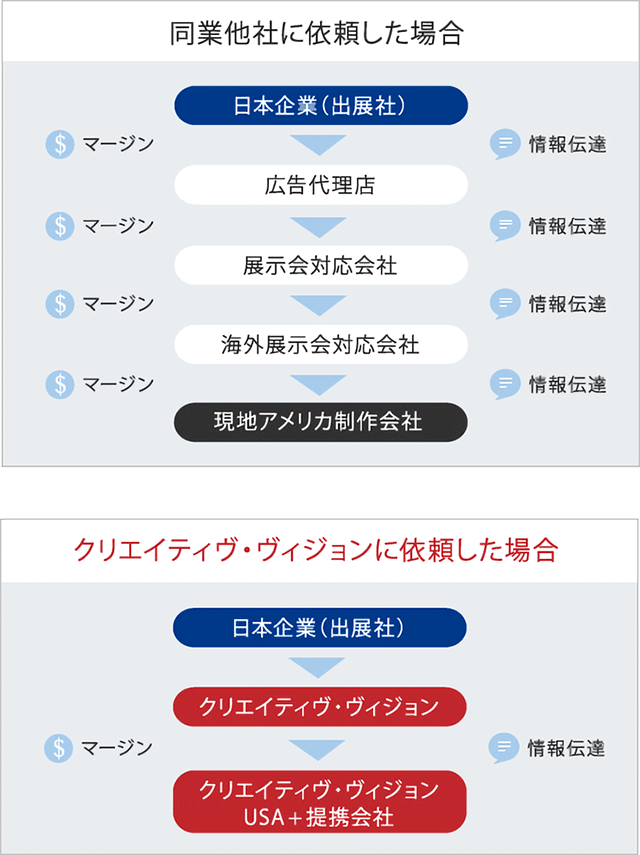 クリエイティヴ・ヴィジョンは、日本(大阪市)とアメリカ(カリフォルニア州サンノゼ)にオフィスが有り、日本企業が安心してアメリカの展示会に出展できるように日本語で対応差し上げます。